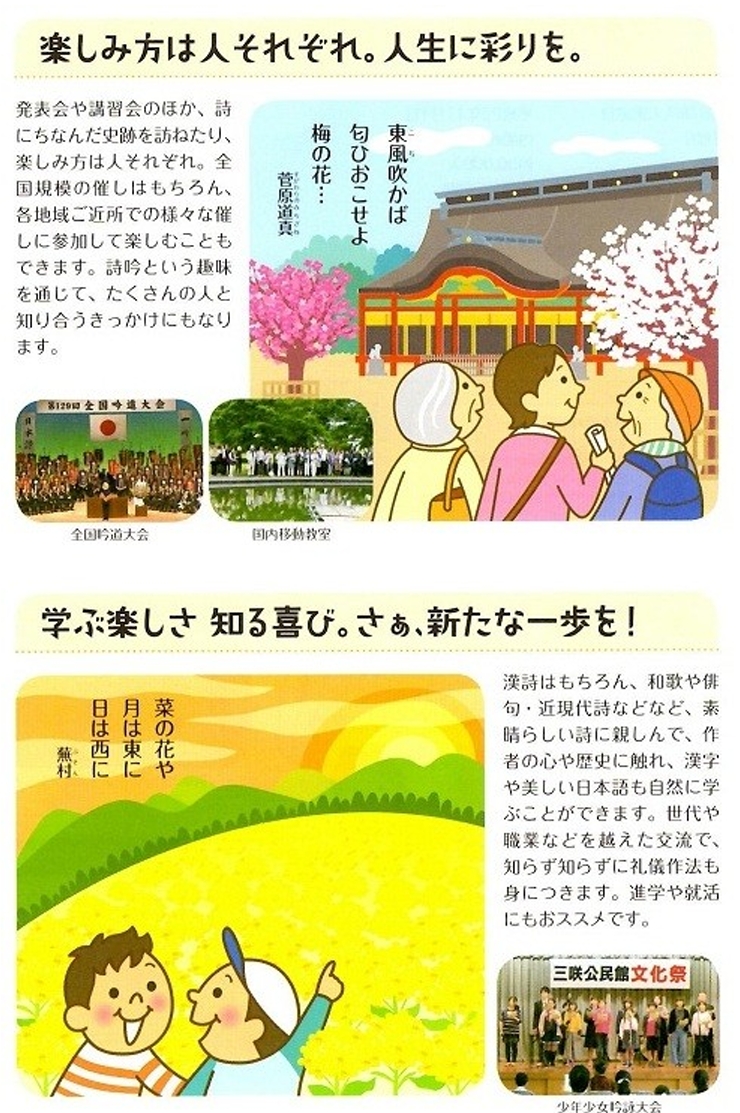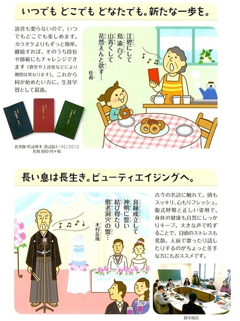 詩吟とは X Facebook LINE 2025.08.022025.11.01 詩吟とは、漢詩・和歌・俳句・俳諧歌・近代詩などに、特有の節をつけて詠うものです。複式呼吸で詩の言葉を大切に、語るように、高く、低く、余韻を引いて謡い上げ、詩情を表現します。 EPSON MFP image EPSON MFP image 子供さんから・・・老若男女、皆さん 健康・若さの秘訣は腹式で大きな声を出す 心の安らぎと癒し、これからの人生を楽しみましょう 詩歌を覚えて歴史の再発見 詩吟の友と歴史探訪、楽しい集い 新しい素晴らしい出会いを