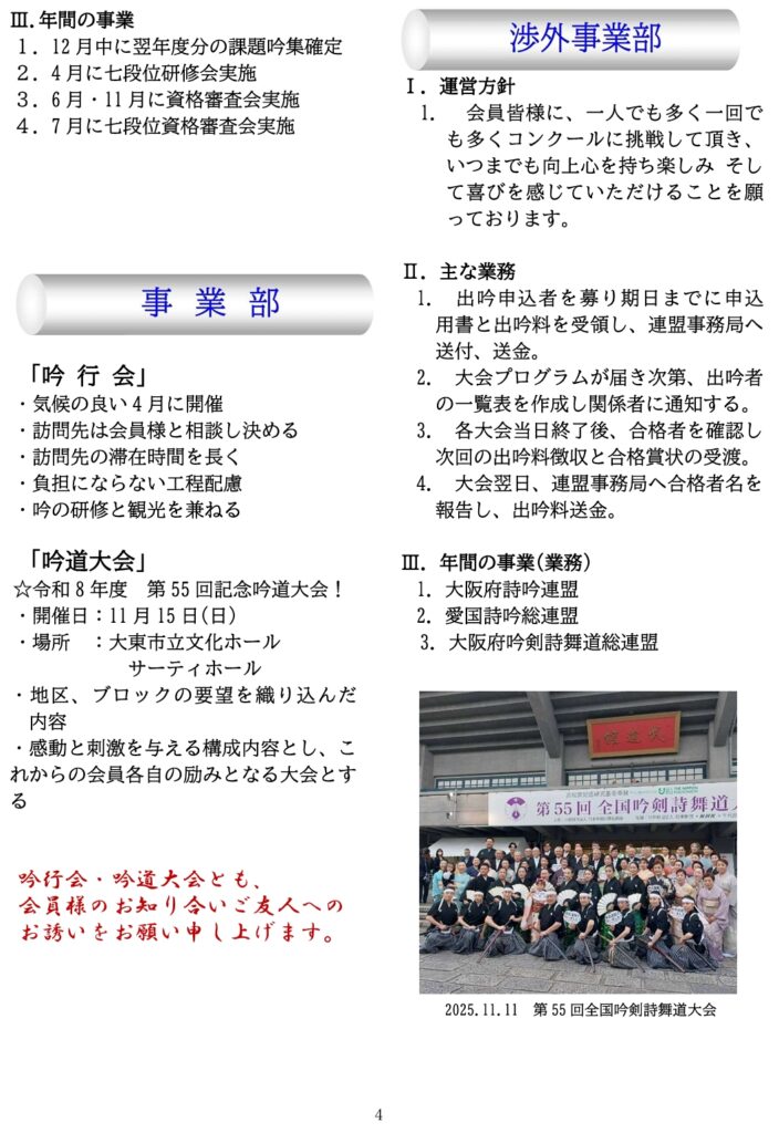 吟風 X Facebook LINE 2026.01.06 吟風ダイジェスト正月号令和8年(2027年) 【訂正】2026.1.251月24日常任理事会で「期日前審査会」は開催しない方針が決まり、審査部運営方針での「期日前審査会の復活」を行います。を削除訂正します。