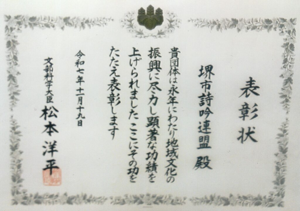 この芸術文化関係団体表彰は全国で2団体、そのうちの一つの表彰であり、文化庁から「詩吟」が評価され選出されたことに、私達、愛吟家にとって誠に光栄で喜ばしいことで、大いに今後の励みに致したいと思います。 (堺市詩吟連盟事務局 深谷岳脩)